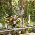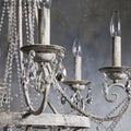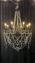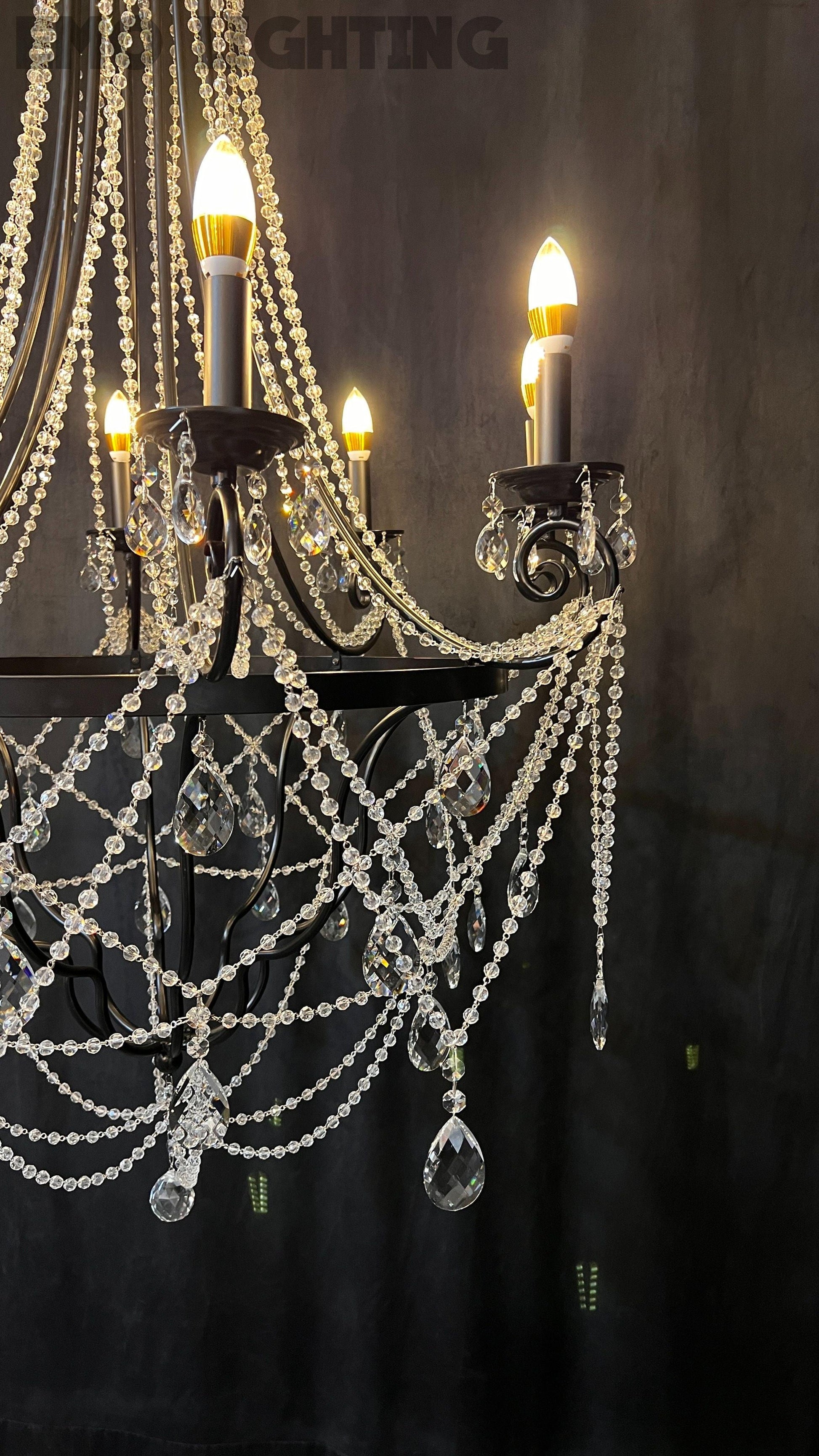 This chandelier combines an iron frame with crystal accents in a vintage design, with candle-like bulbs with small saucer cups resting on a curved iron arm. Strands of crystal beads are intertwined with a circular drop at the end for a romantic French touch. Available in two colors: classic black and white, it transports you back to the Middle Ages. This look evokes a timeless aesthetic for a variety of high-ceilinged rooms, from staircases to dining tables, and commercial areas such as vintage cafes and themed restaurants. It is absolutely stunning whether the lights are on or off.