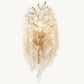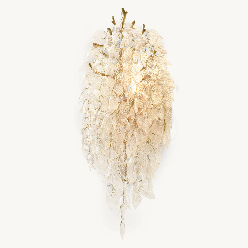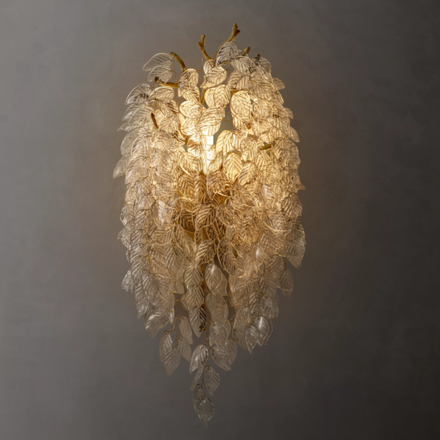- 13 strings of textured glass leaves hang from sculpted iron branches.
