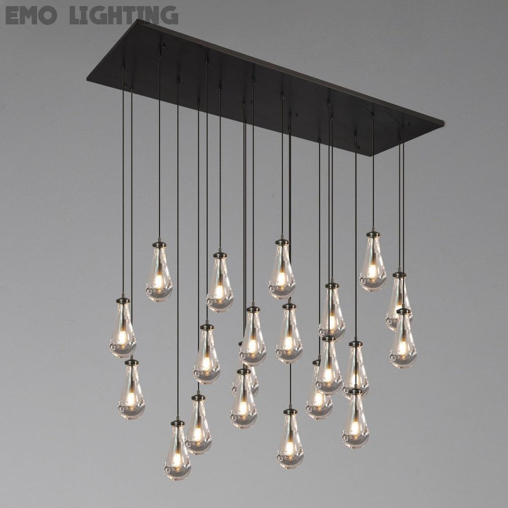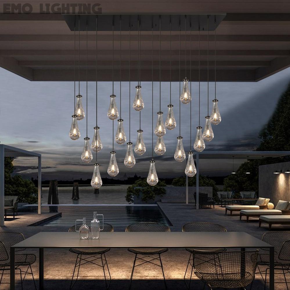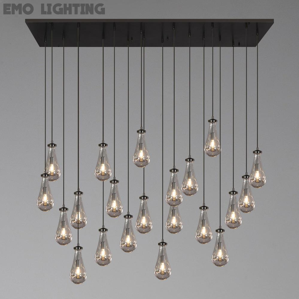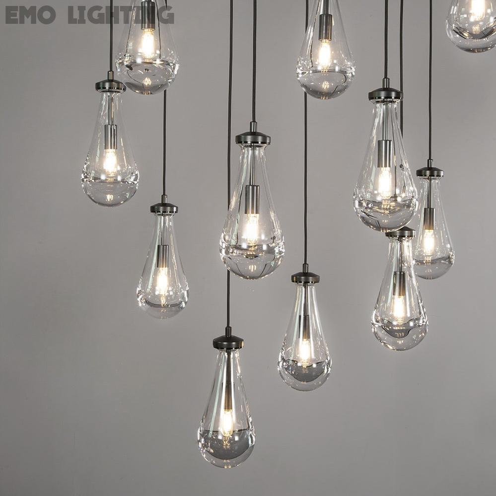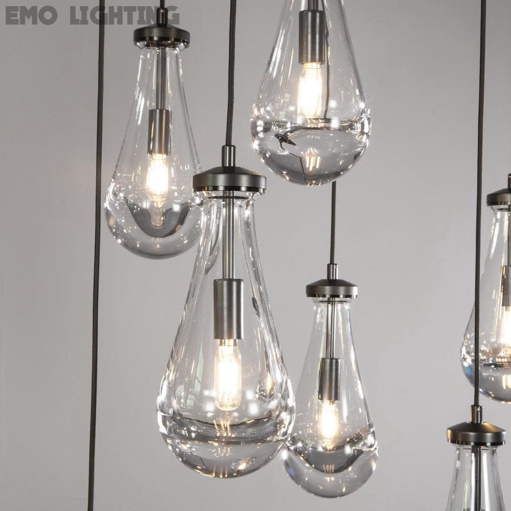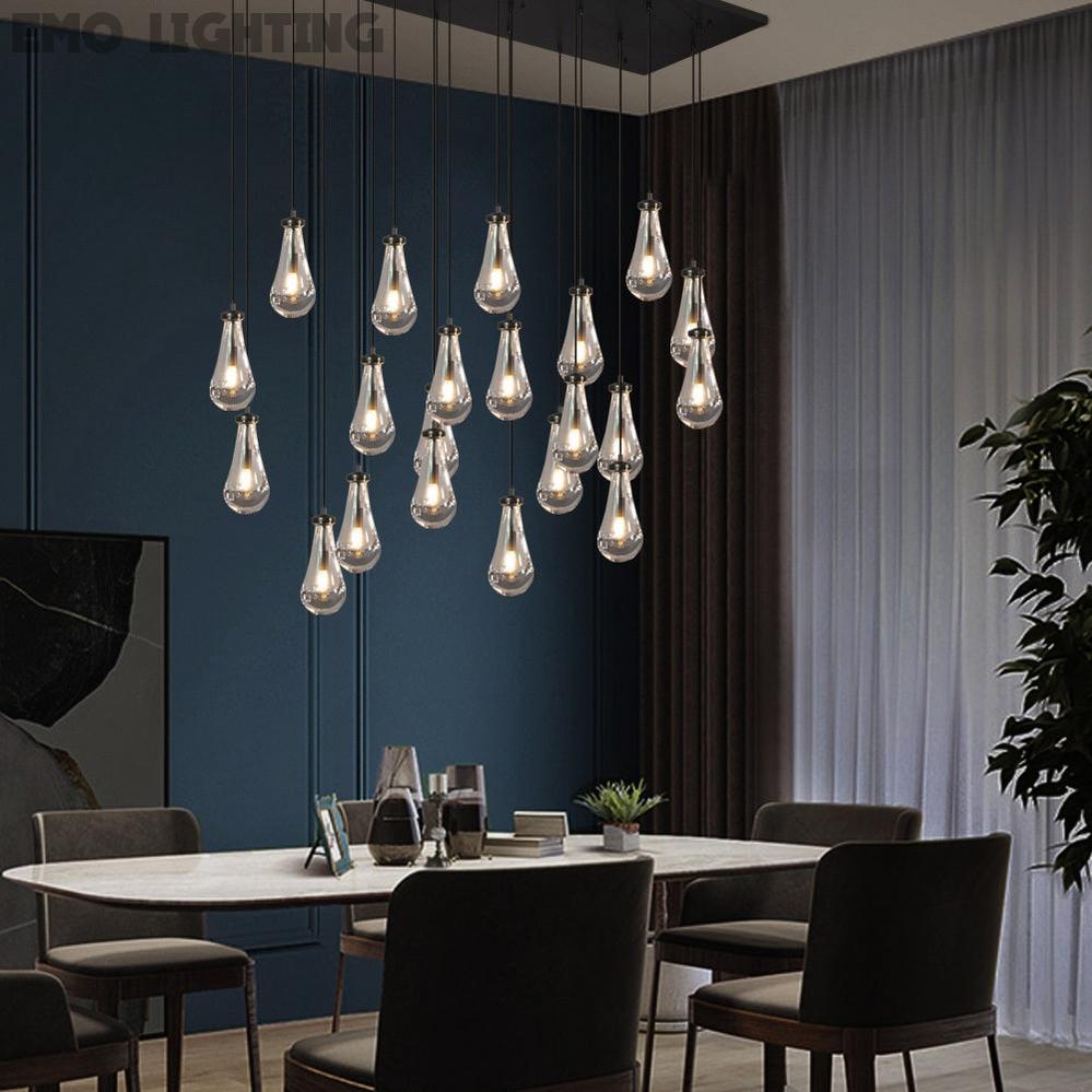 Much like the rhythm of a rainstorm itself. Suspended from slim black cords, drops of blown glass encase the bulbs creating the illusion of underwater illumination and cast luminous ripples that wash across ceilings and walls.