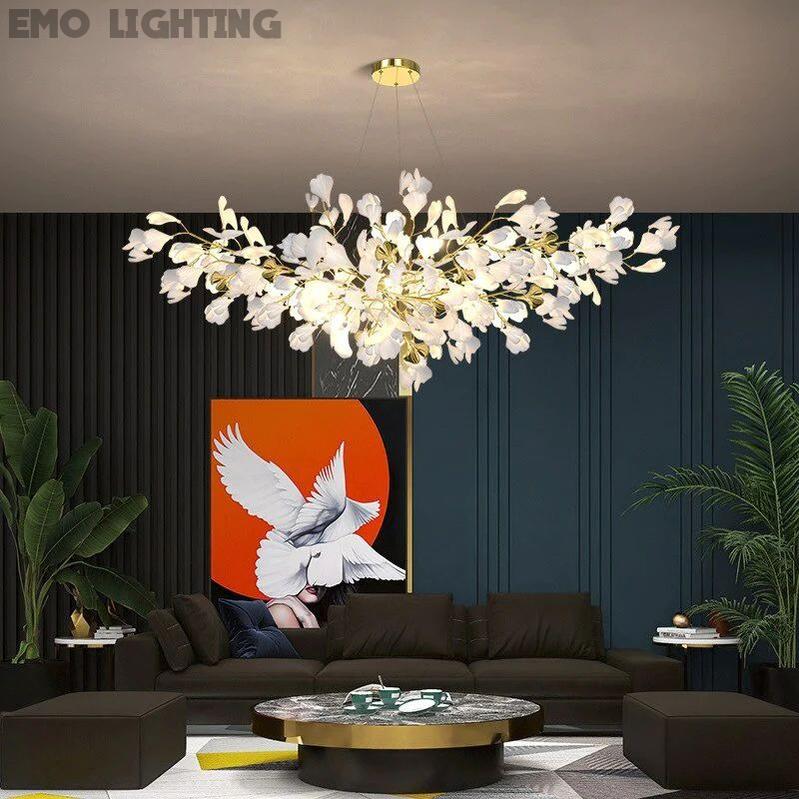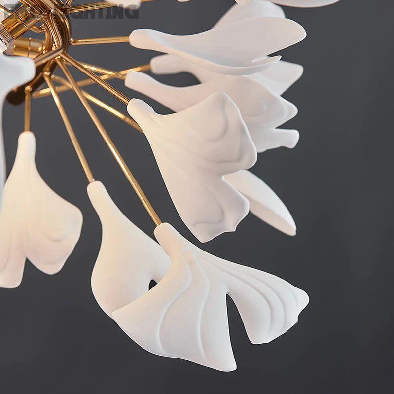 Introducing GINKGO,a breathtaking chandelier inspired by the ancient Ginkgo Biloba tree.Expertly crafted with a golden copper branch centerpiece and artisan-quality ceramic leaves,this stunning white floral chandelier is a testament to the tree’s beauty and longevity.It will brighten up any home with its fresh and modern aesthetic—suspend it horizontally or vertically to best suit your space.