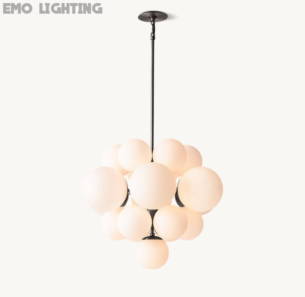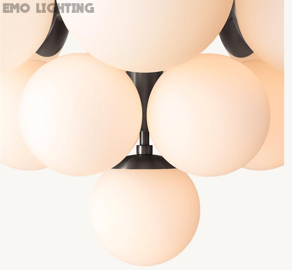 An elegant grouping of opal matte glass globes in varying sizes suspends from a refined frame in the Cirque collection. Arranged in tiers, its pure, modern form evokes celestial bodies floating in space.
