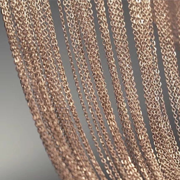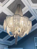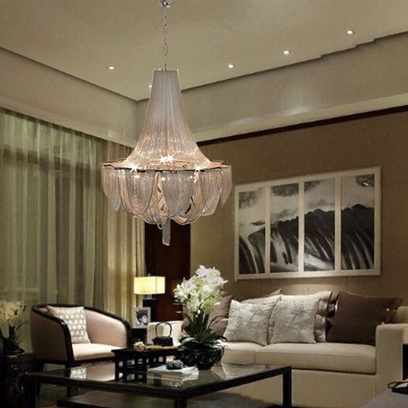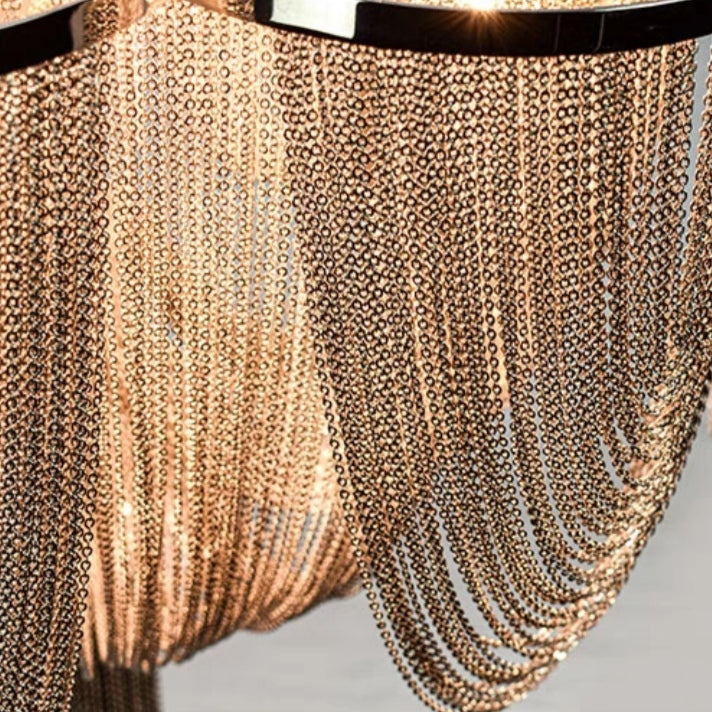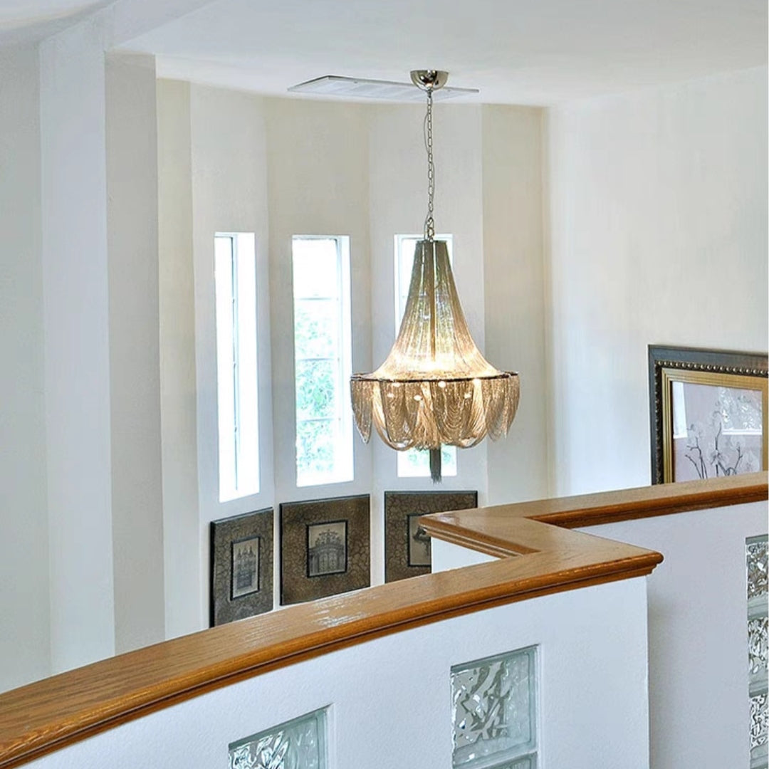The body of this chandelier is made of stainless steel and aluminium with a multi-crafted finish for saturated colour and durability. It has been designed in a luxuriously elegant contemporary style and its shape is full of creativity and novelty, with intricate hand-woven aluminium chains that have a delicate texture and are simple yet natural. The tasselled aluminium chain gives the body of the light a waterfall-like shape. It is absolutely stunning whether the light is on or off. Suitable for a variety of applications including villas, duplexes, living rooms with high ceilings and more.
