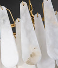 A striking fusion of organic beauty and modern elegance, this alabaster pendant chandelier features cascading teardrop-shaped stone pieces, each naturally veined and softly translucent. Suspended from a refined iron frame in a warm metallic finish, the layered alabaster diffuses light with a gentle, ambient glow, creating a sophisticated focal point in any interior.