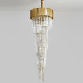 Perfect for making a stunning impression in spaces with high ceilings, this luxury chandelier is made with laser-cut crystal and a stainless steel body. Superb craftsmanship is apparent throughout this beautiful piece.This fixture is most appropriate for grand entry areas and lobbies or for living/dining areas with cathedral ceilings. Designed in a spiraling pattern, the chandelier is crowned in a gold-colored shade that is suspended by an adjustable chain mounted flush to the ceiling. |