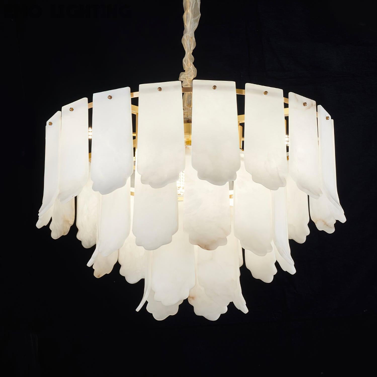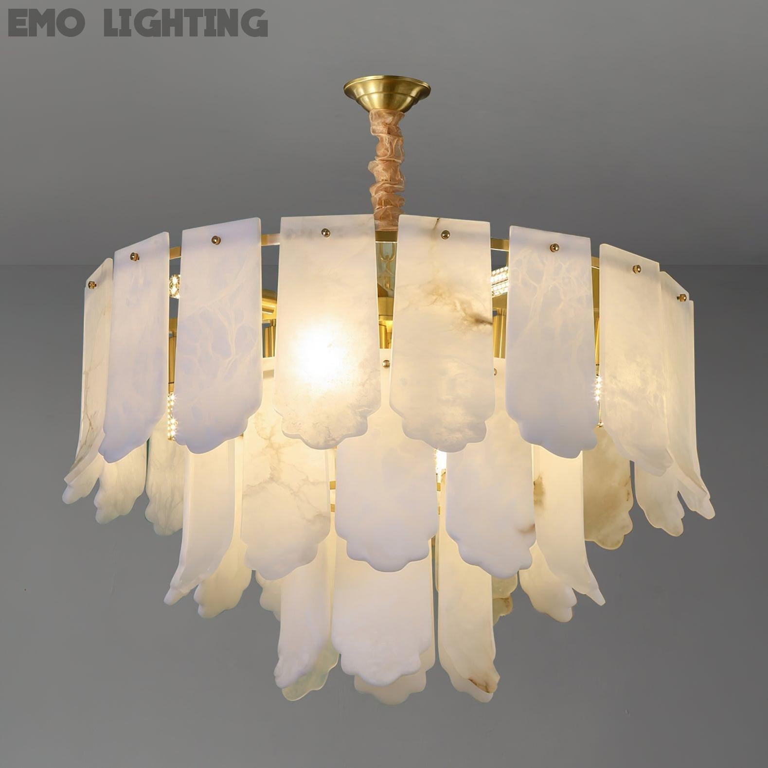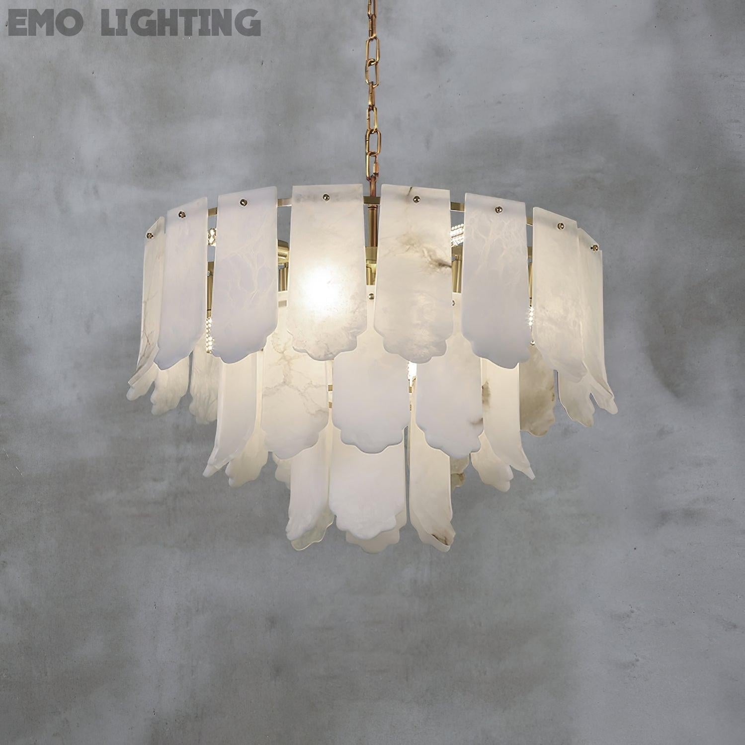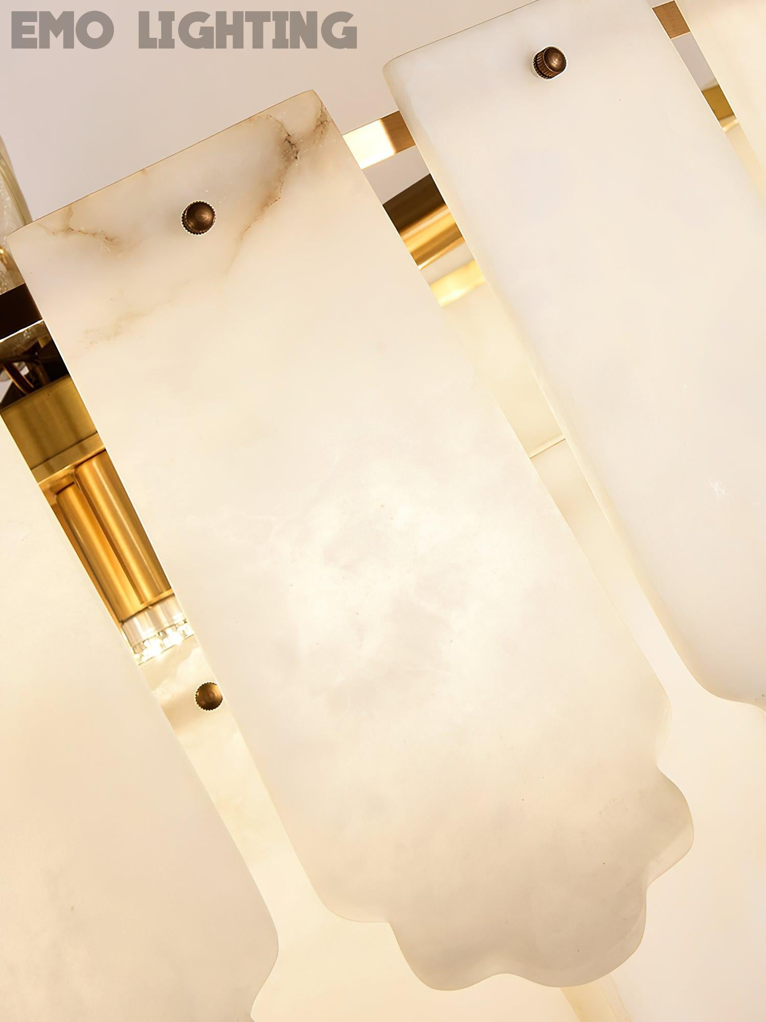 Designed by Radilum's chief designer, the Evander Chandelier is crafted from alabaster in a multi-layered herringbone pattern, highlighted by white swirls. Hang it in a hallway, bedroom or living room to bring the laid-back elegance of a holiday island into your home.