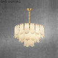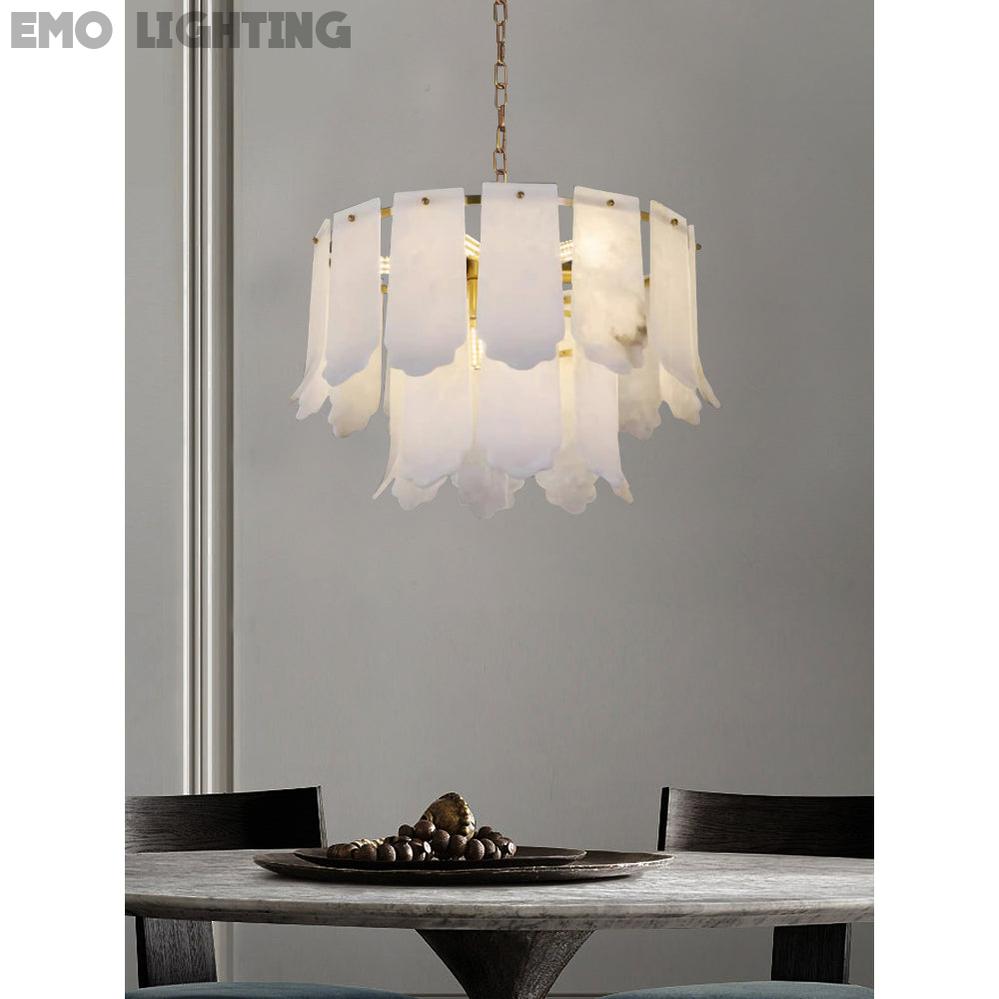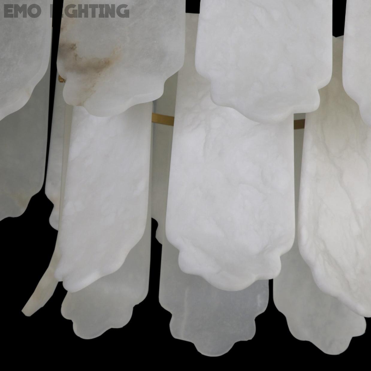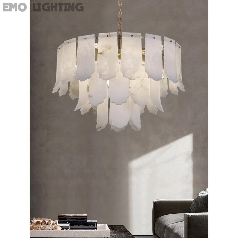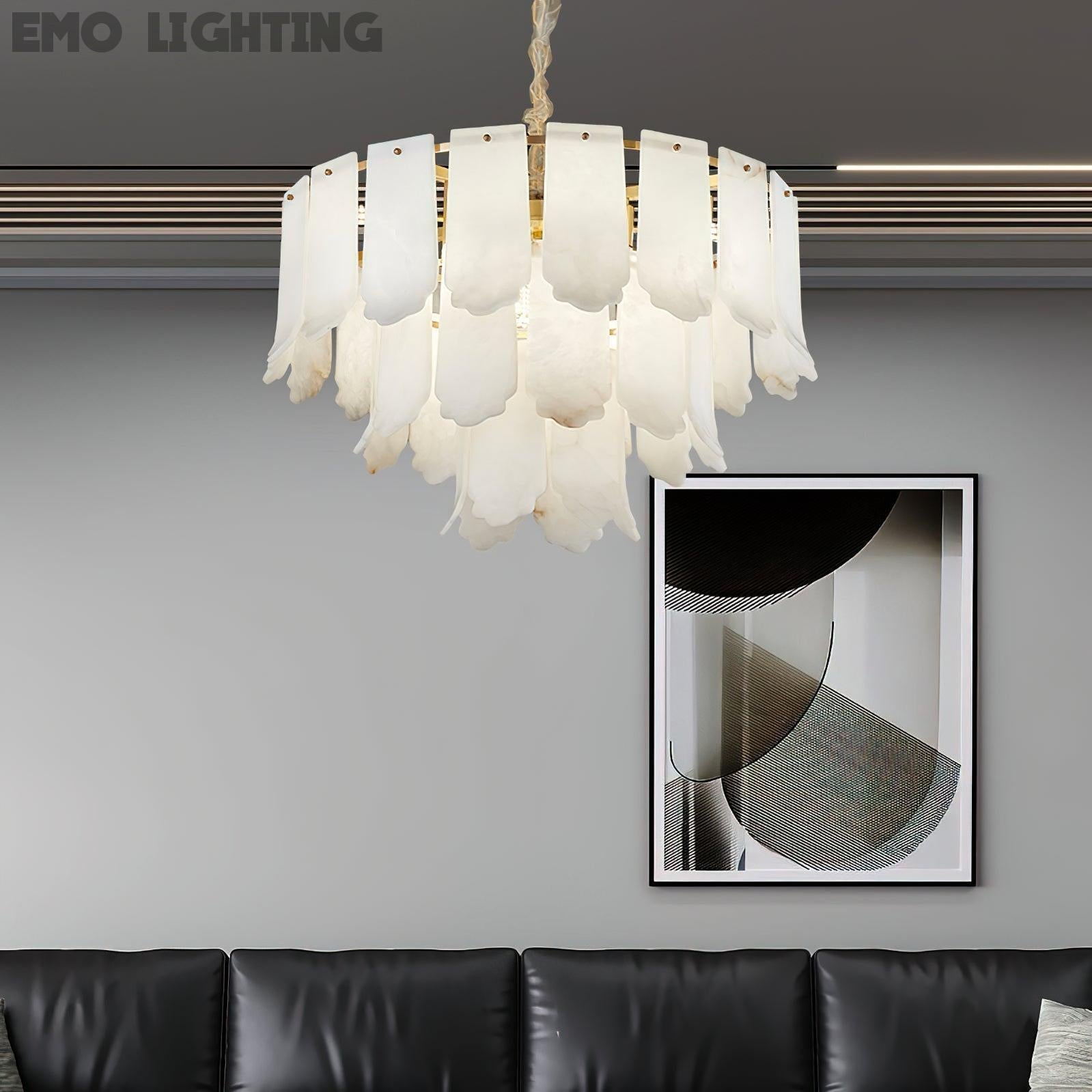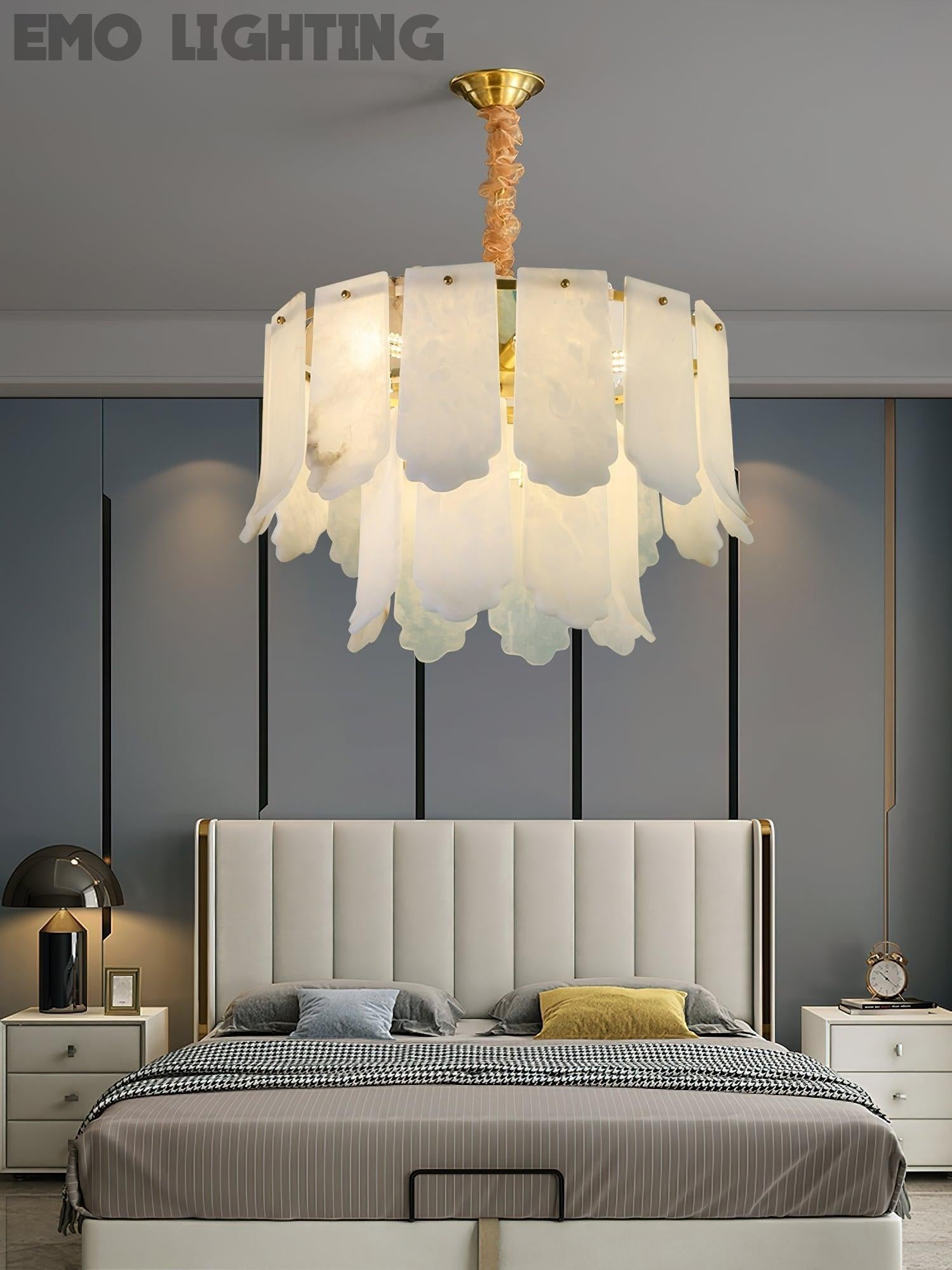Designed by Radilum's chief designer, the Evander Chandelier is crafted from alabaster in a multi-layered herringbone pattern, highlighted by white swirls. Hang it in a hallway, bedroom or living room to bring the laid-back elegance of a holiday island into your home.