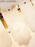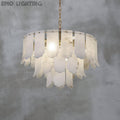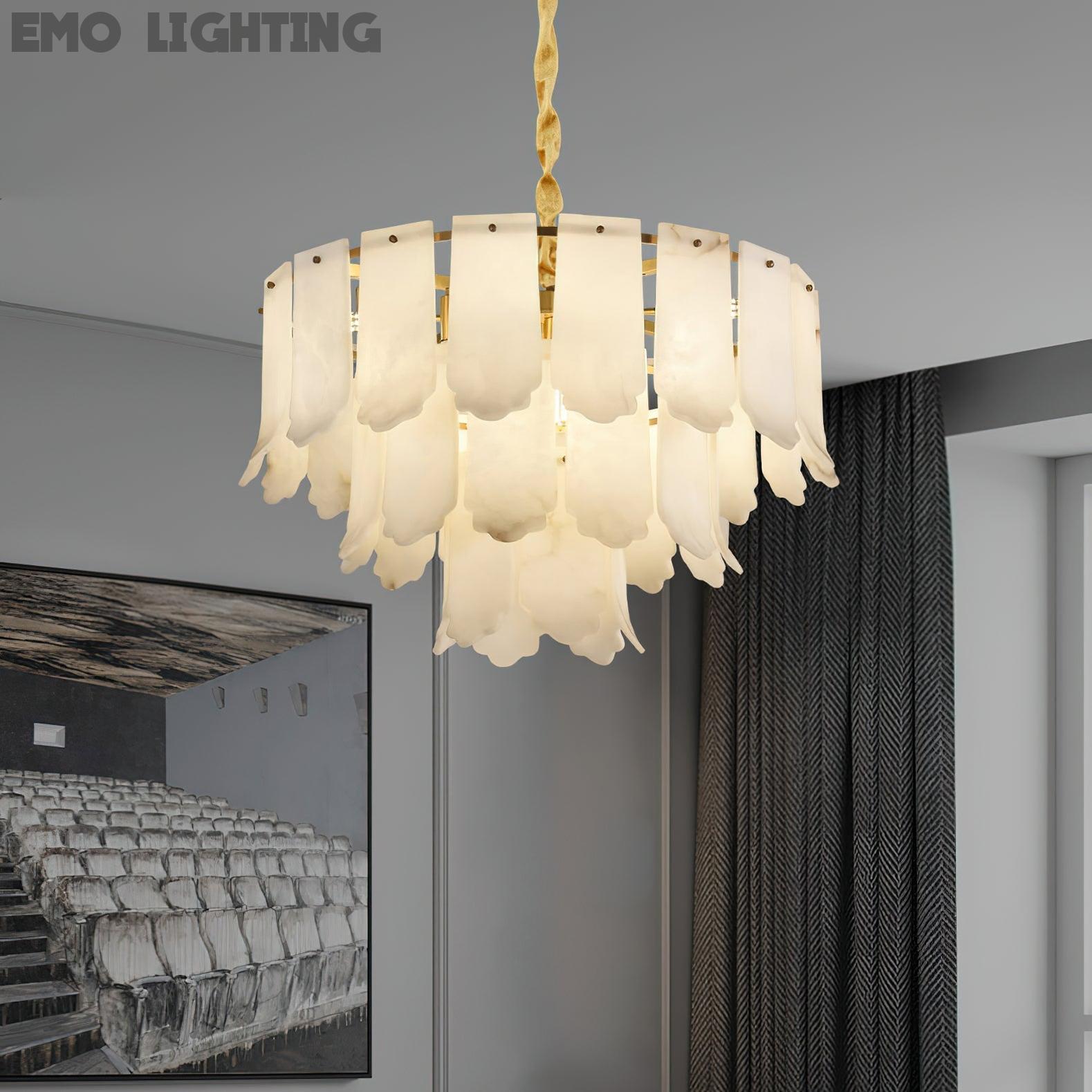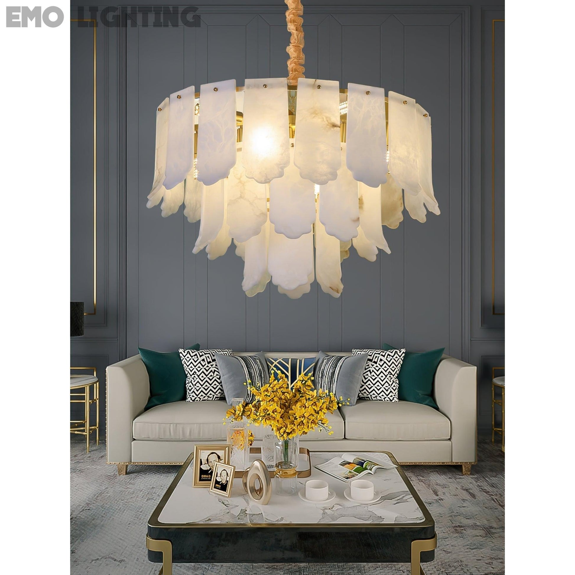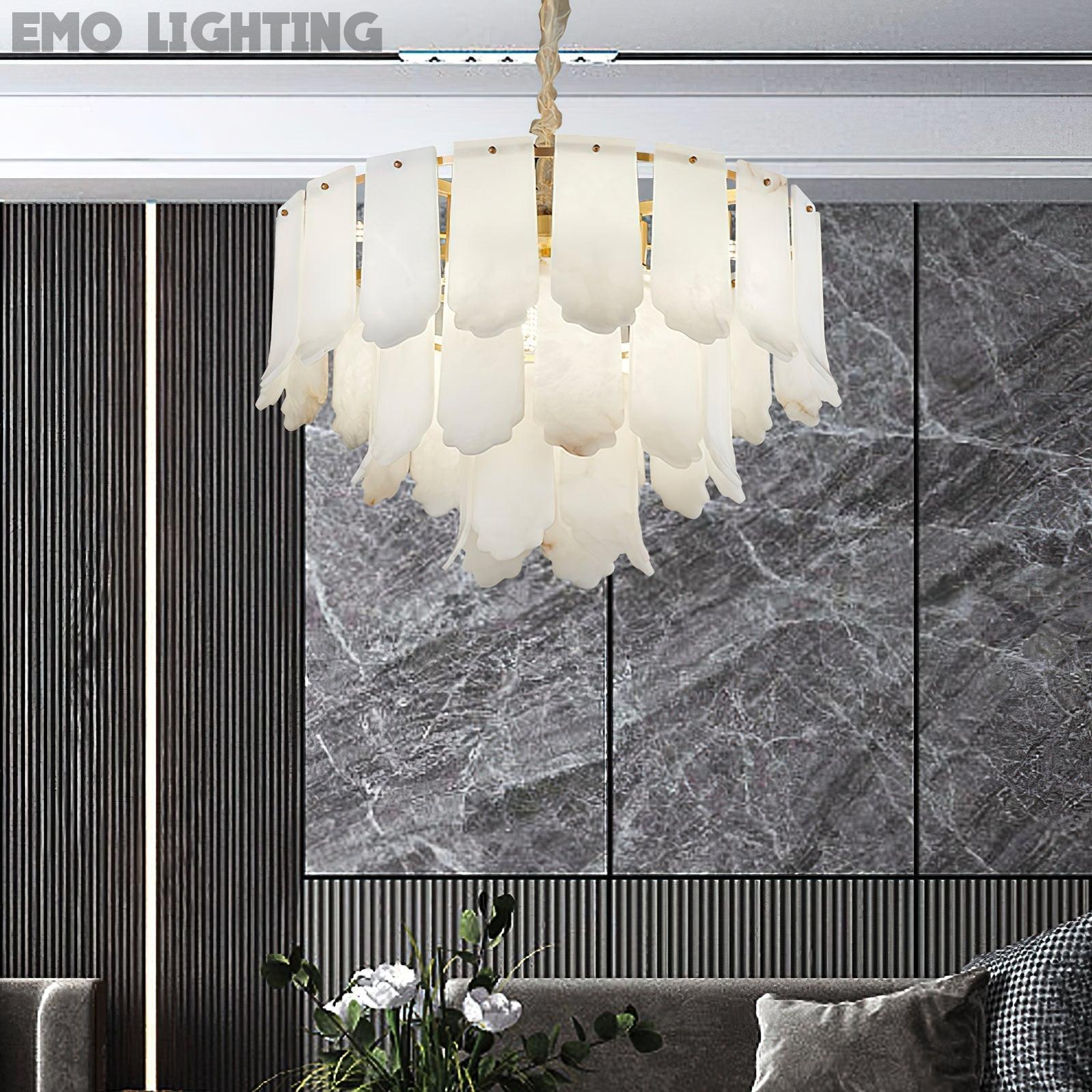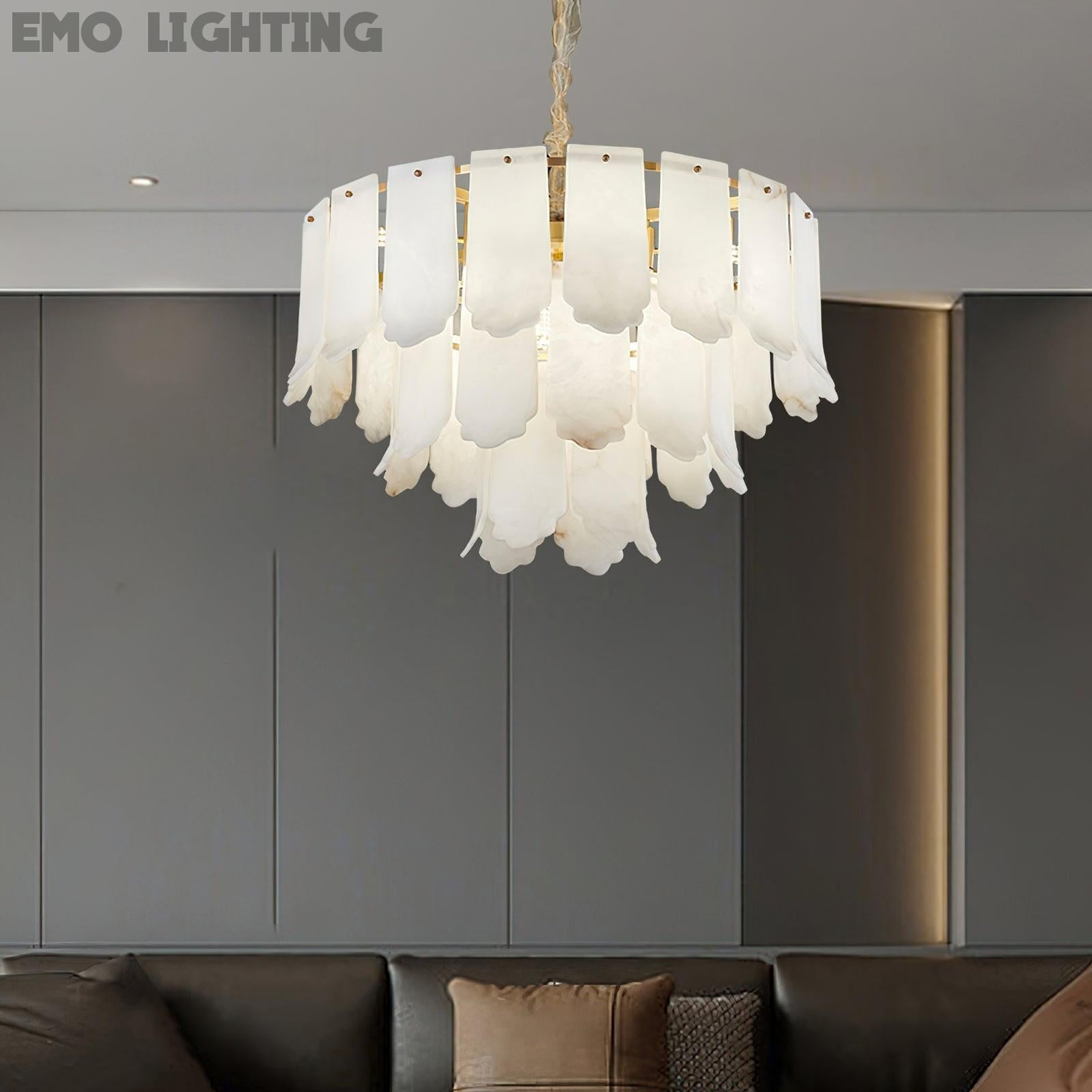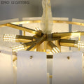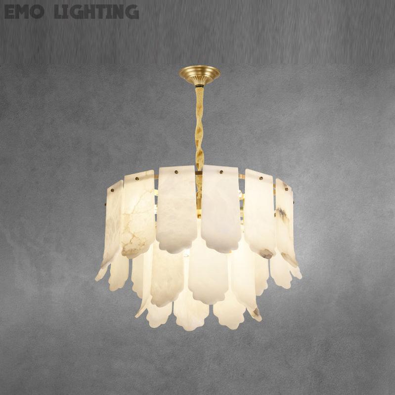 Designed by Radilum's chief designer, the Evander Chandelier is crafted from alabaster in a multi-layered herringbone pattern, highlighted by white swirls. Hang it in a hallway, bedroom or living room to bring the laid-back elegance of a holiday island into your home.