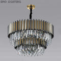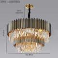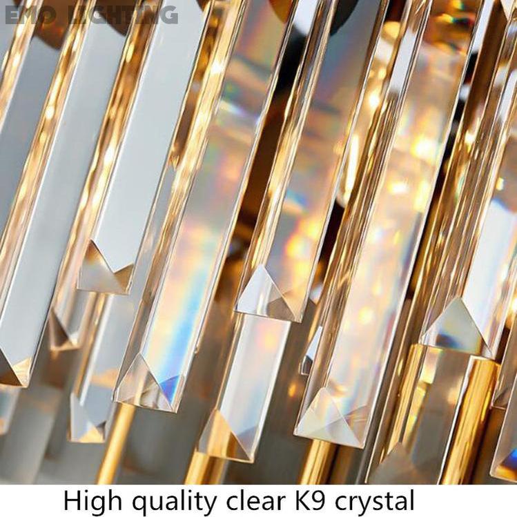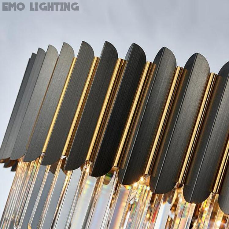 This incredible piece commands the attention of everyone who enters the room. A truly stylish modern crystal chandelier that fits perfectly in any space in your home. The color of the frame is very similar to gunmetal gray with gold inlay trim detail between the strips. |