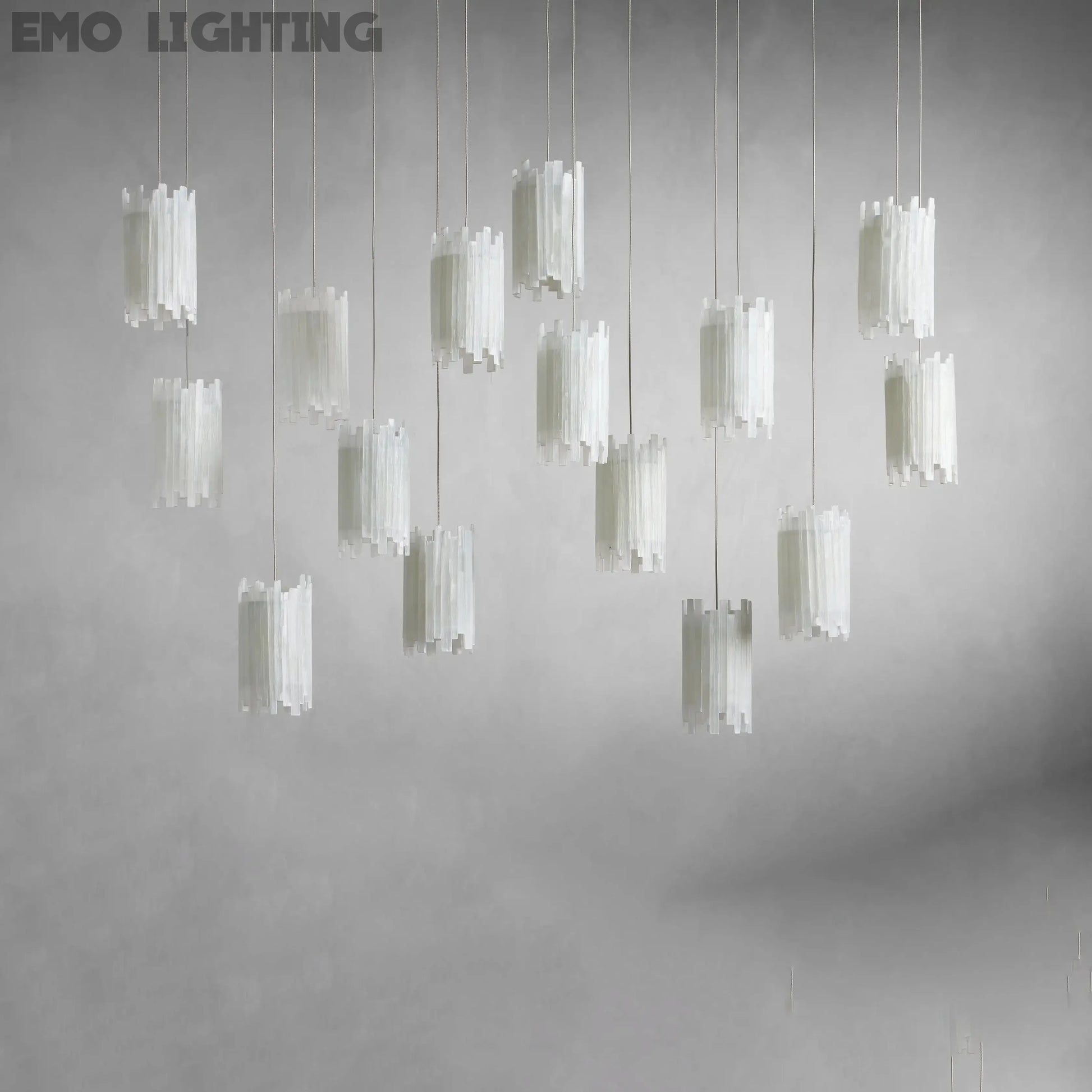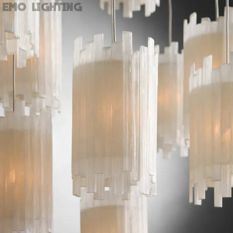 Capture the beauty of falling stars casting a stunning glow in your home with our Gianna Chandelier. Featuring thin, adjustable PVC cables that are customizable to your space, each drop juxtaposes industrial materials with exquisite natural selenite stone shades. When illuminated, the drops appear to be floating in midair—creating a unique and elevated statement in any room.