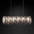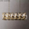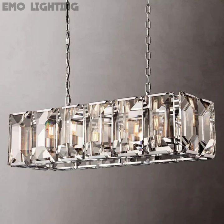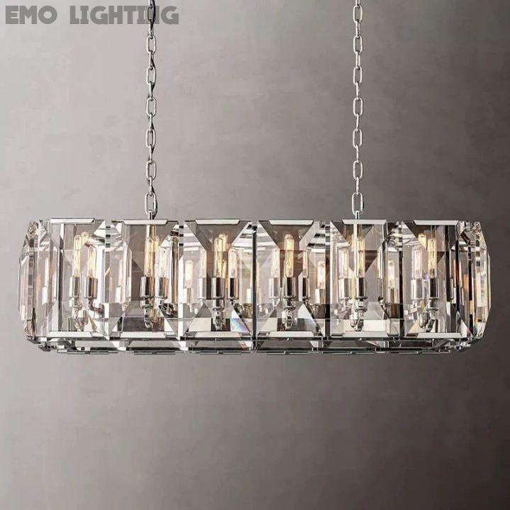 Inspired by the German chandeliers of the 1970s, our fixtures evoke the boldness and glamour of that era. Using a circle of faceted crystal glass prisms to reflect and refract light, the designer captures the essence of an emerald-cut diamond.