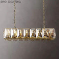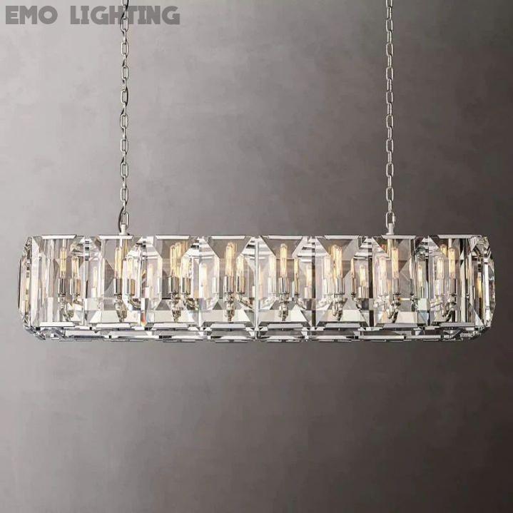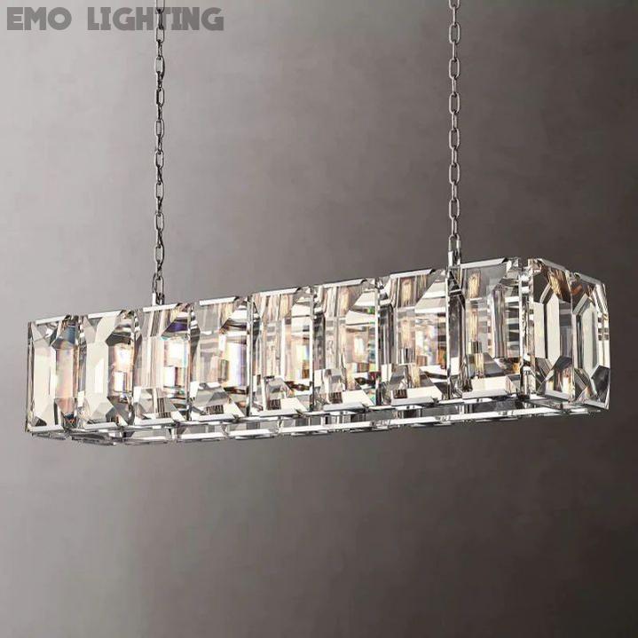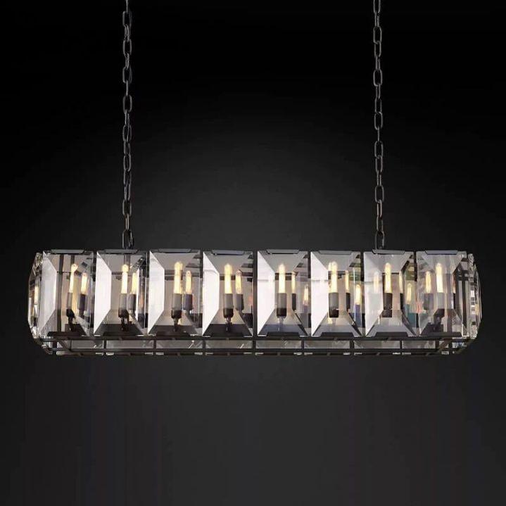 Inspired by the German chandeliers of the 1970s, our fixtures evoke the boldness and glamour of that era. Using a circle of faceted crystal glass prisms to reflect and refract light, the designer captures the essence of an emerald-cut diamond.