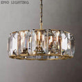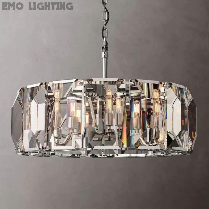Inspired by the German chandeliers of the 1970s, our fixtures evoke the boldness and glamour of that era. Using a circle of faceted crystal glass prisms to reflect and refract light, the designer captures the essence of an emerald-cut diamond.