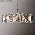 Inspired by the German chandeliers of the 1970s, our fixtures evoke the boldness and glamour of that era. Using a circle of faceted crystal glass prisms to reflect and refract light, the designer captures the essence of an emerald-cut diamond.