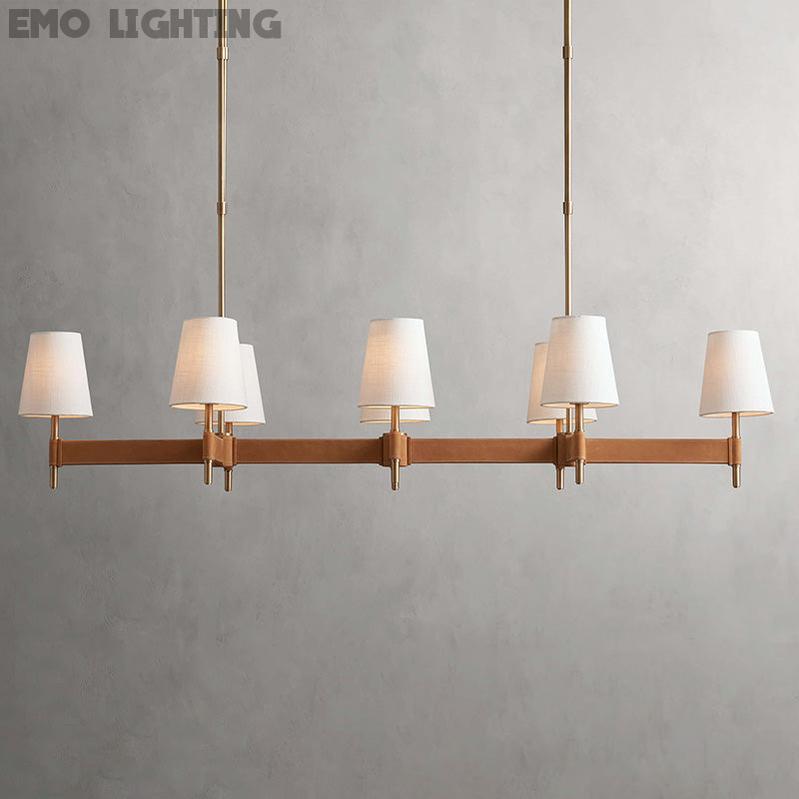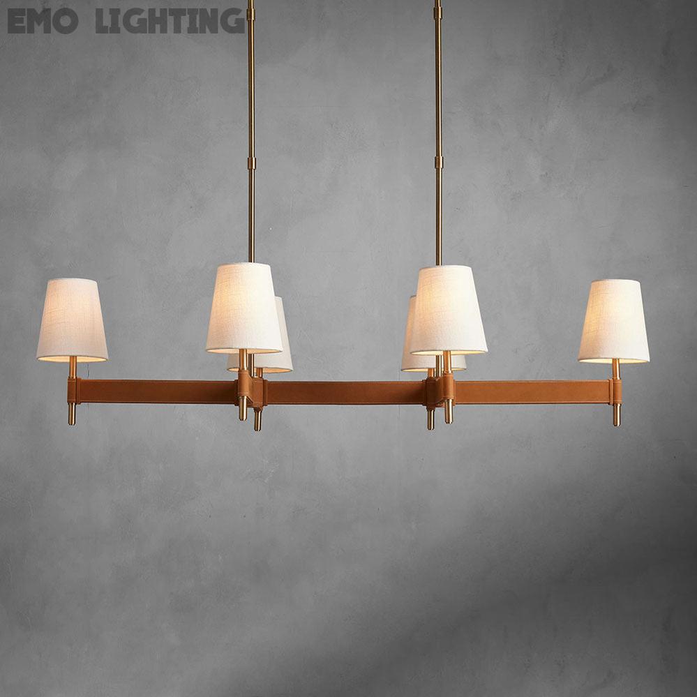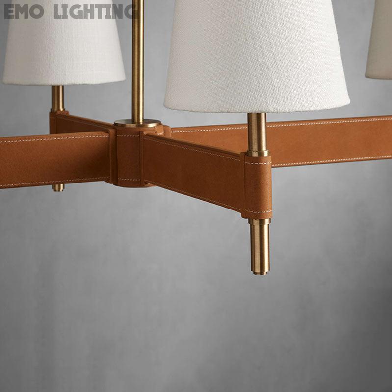- Crafted from brass with an antiqued finish complemented by leather details and white linen shade.