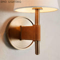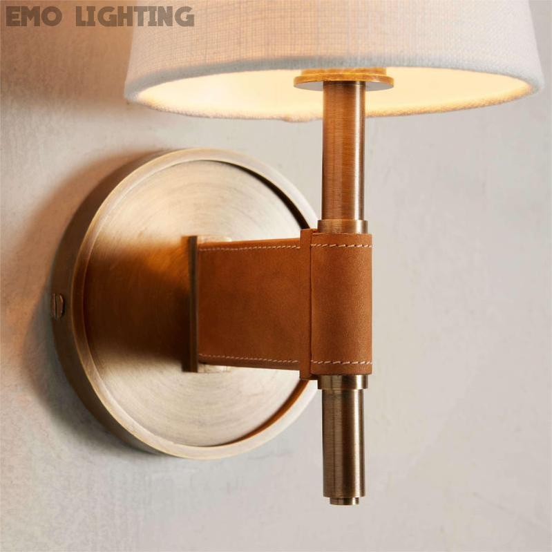 - Crafted from brass with an antiqued finish complemented by leather details and white linen shade.