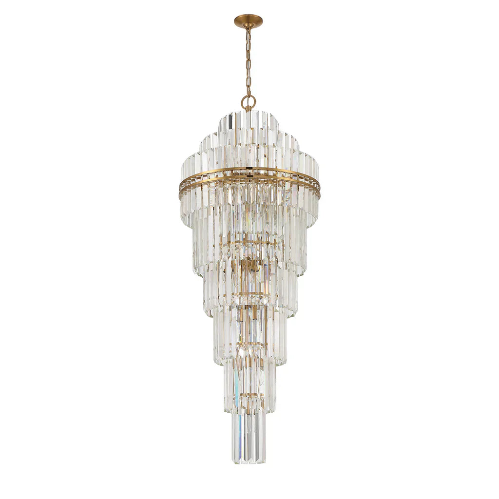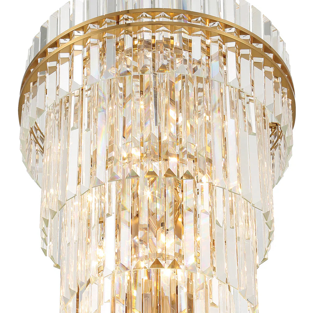The Hayes Round Chandelier 24" 4-Tiers exudes elegance and modernity, making it an excellent addition to any bathroom or vanity area. Featuring four carefully arranged lights, this sconce is crafted with faceted crystal that captures and reflects light beautifully, creating a sparkling effect. The fixture is available in both Aged Brass and Polished Nickel finishes, offering a versatile, refined look that complements various decor styles. Perfect for adding a touch of luxury and functionality to your space, this wall sconce brings both style and practicality to your bathroom lighting.