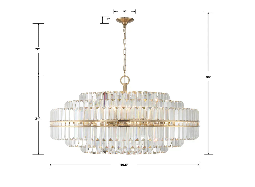 The Hayes Round Chandelier 41" 4 Tiers exudes elegance and modernity, making it an excellent addition to any bathroom or vanity area. Featuring four carefully arranged lights, this sconce is crafted with faceted crystal that captures and reflects light beautifully, creating a sparkling effect. The fixture is available in both Aged Brass and Polished Nickel finishes, offering a versatile, refined look that complements various decor styles. Perfect for adding a touch of luxury and functionality to your space, this wall sconce brings both style and practicality to your bathroom lighting.