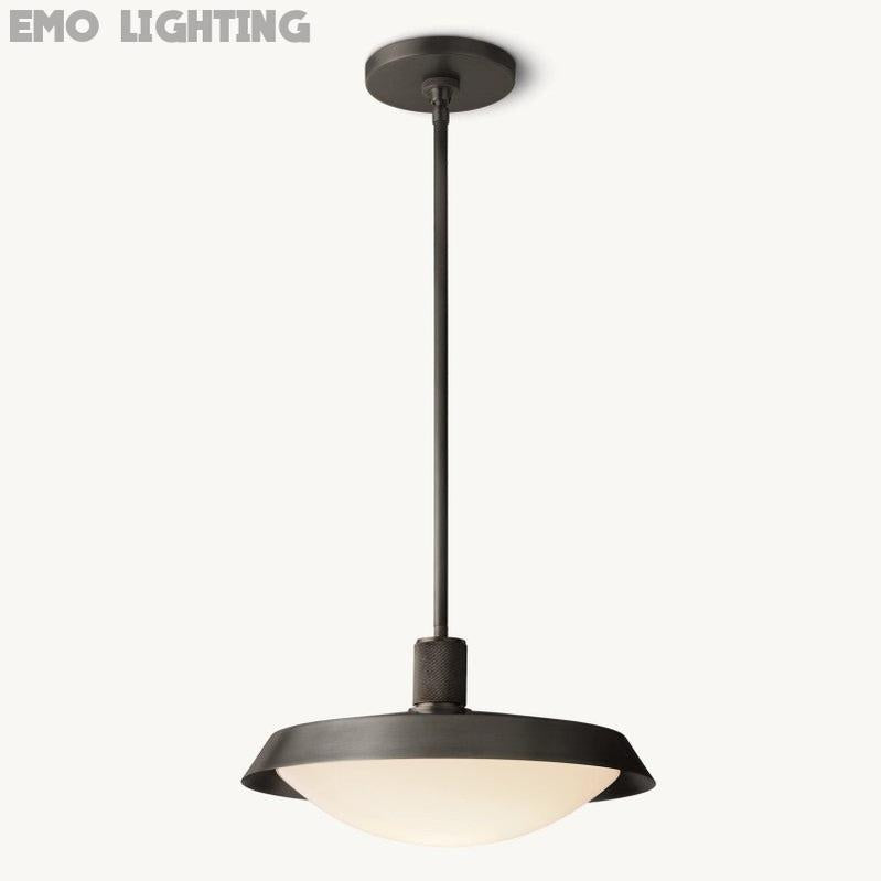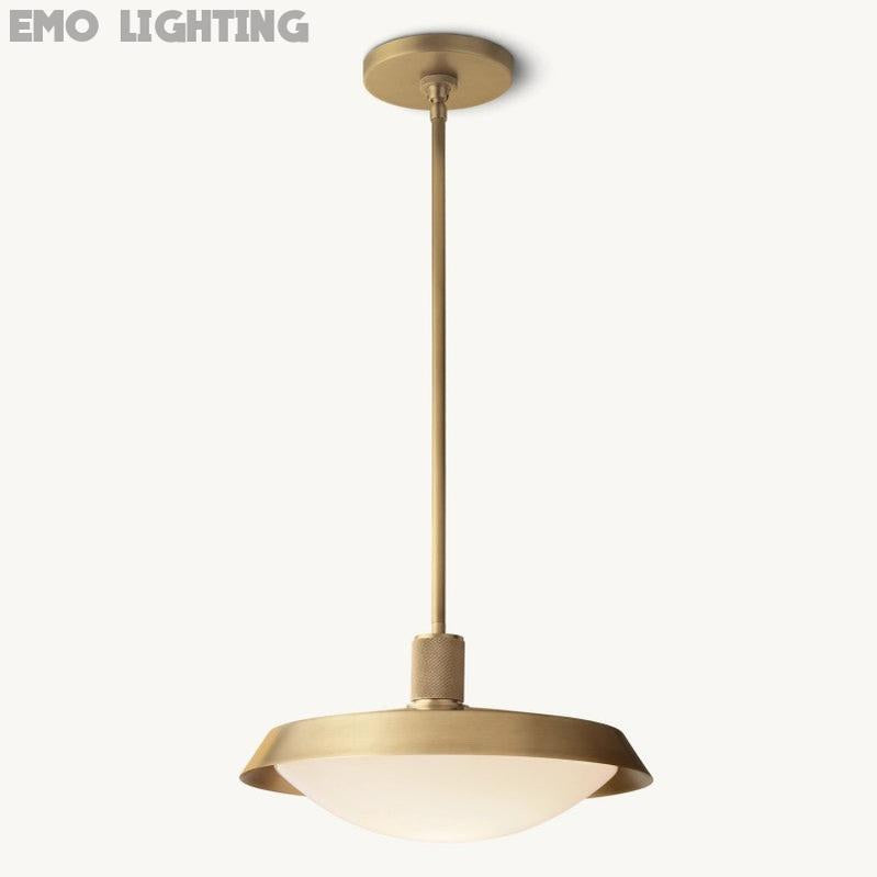 Designer Ian K. Fowler's take on the traditional barn lamp celebrates the minimalist aesthetic of midcentury design. A juxtaposition of sleek lines and luxe materials, the solid brass construction and knurled detailing reveal its industrial roots. In contrast, a milk glass shade gently diffuses the light, casting a warm glow when illuminated.