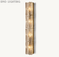 Crafted of solid cast glass, the collection's interlocking planes recall the geometric precision of the midcentury International Style. A study in repetition and rhythm, the linear form employs open space to lend a weightless feel. Gently rounded corners on the fluid, rippled panes subtly soften the outline, while diffused light glows from within.