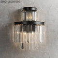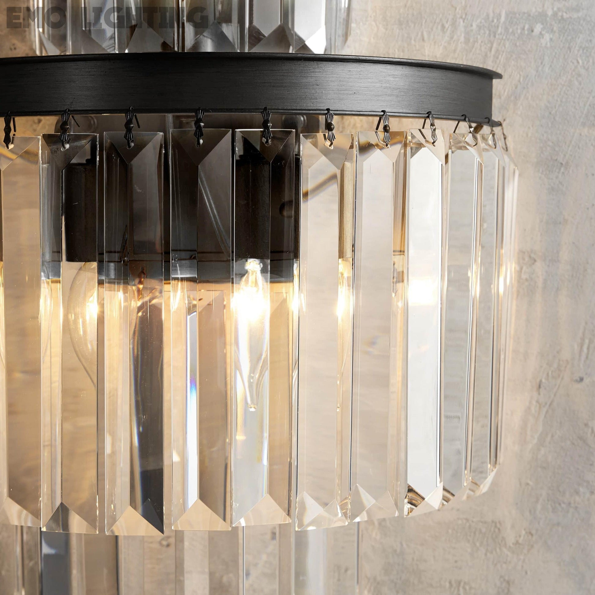 French Art Deco style of the 1920s is reborn in our glamorous Leyland Lighting Collection, featuring layered row upon row of faceted glass crystals from a rustic iron frame.