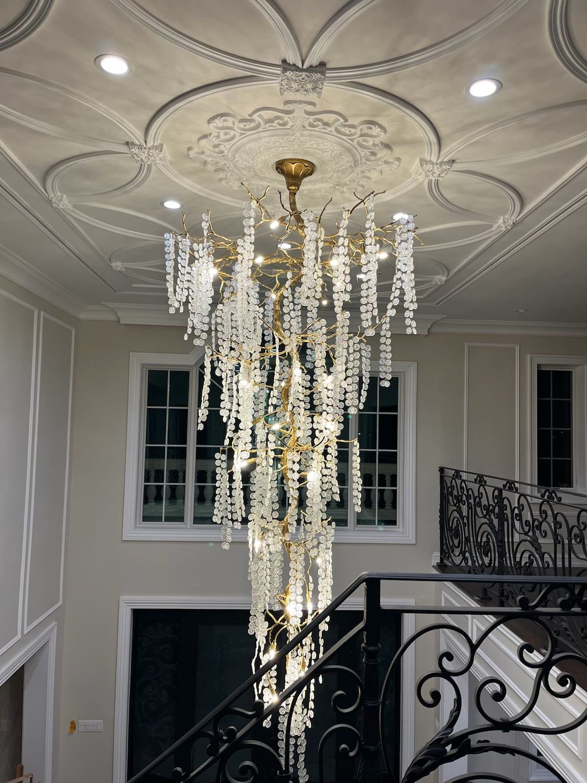 Lorna 2 Story Foyer Large Branch Chandelier is a luxurious chandelier made of brass, and glass discos. Inspired by the organic nature, this chandelier is a great choice for 2 story foyer, or the staircase. It is an elegant, charming, looks like a blossom tree.