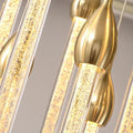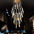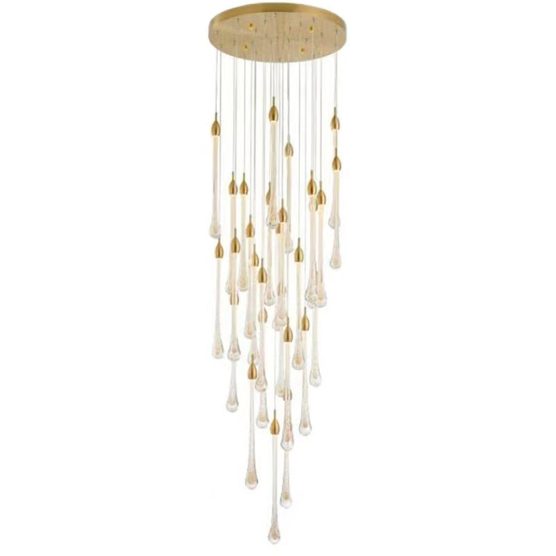 This chandelier combines classic and contemporary elements with eye-catching results,featuring brass frame trimmed with numerous long raindrops,offering a modern and warm atmosphere.Numerous golden wires are placed in the glass lampshades,adding another sense of luxury and modernism to itself.Two types for selection:round or rectangle sucken disk.Suitable for various application scenario,including staircase,loft,kitchen islandd,high-ceiling living room,walk-in closets,etc.