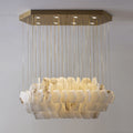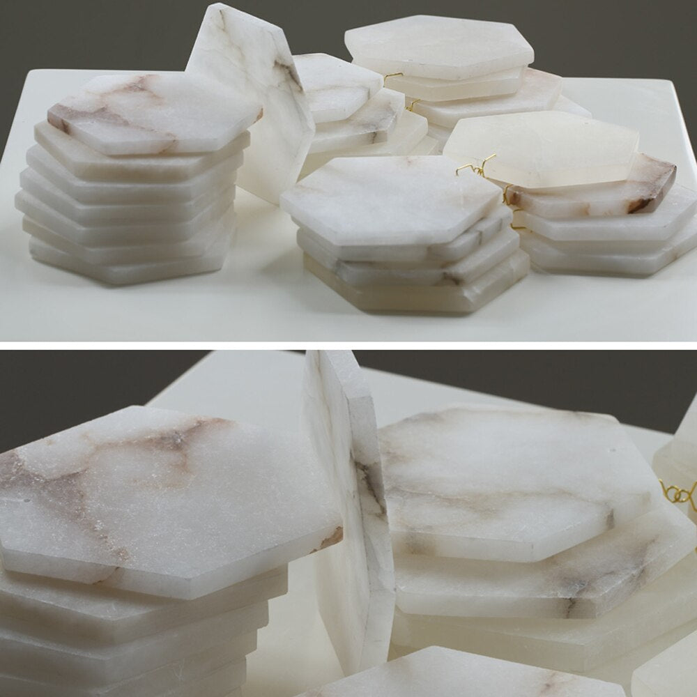 When illuminated, the marble seems to glow as if lit from within, casting a warm radiance that instantly elevates any space. But the real art is in the details. Each marble disk is carefully hand cut and polished to enhance its natural beauty, then strung together on a delicate brass chain to create an organic, free-form shape. The result is a lighting fixture so sculptural, so visually arresting, you'll want to showcase it prominently. Hang it over a dining table, kitchen island or entryway console and be prepared for an endless stream of compliments. Part decor, part conversation piece, this marble moonshade chandelier is destined to be the focal point of any room. Elegant, earthy and strikingly unique, it's a work of art that illuminates in more ways than one.