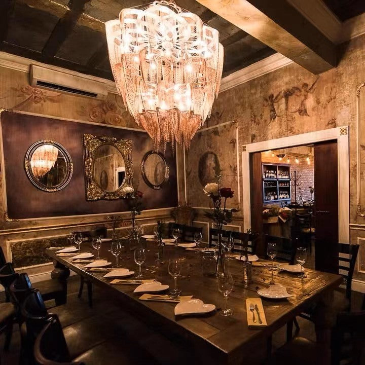The body of this chandelier is made of metal and aluminium with a multi-crafted finish for saturated colour and durability. It has been designed in a luxuriously elegant contemporary style and its shape is full of creativity and novelty, with intricate hand-woven aluminium chains that have a delicate texture and are simple yet natural. The tasselled aluminium chain gives the body of the light a waterfall-like shape. Suitable for a variety of applications including villas, duplexes, living rooms with high ceilings and more.