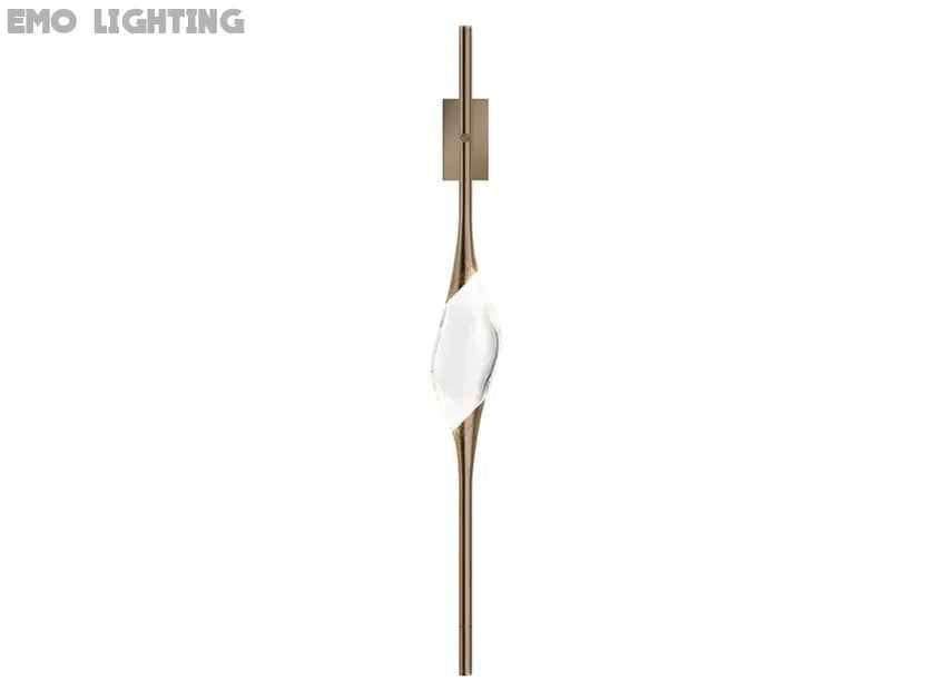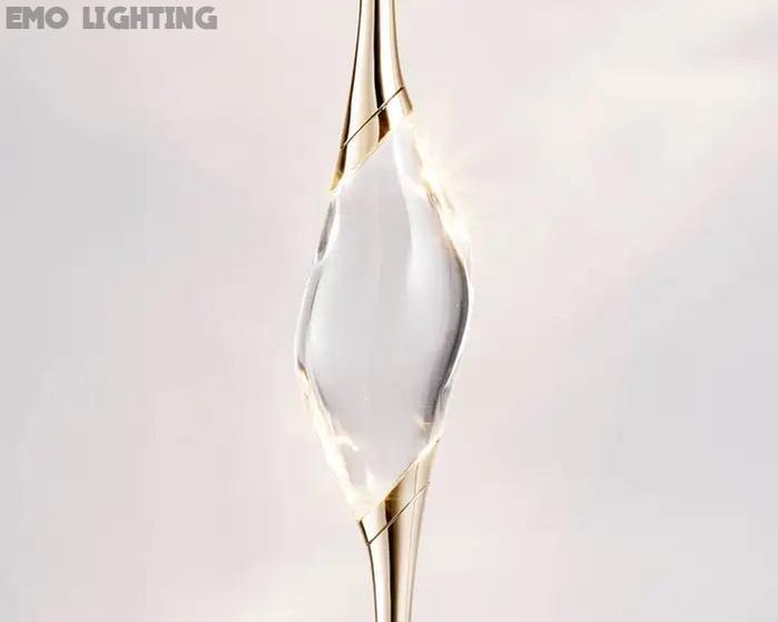 Il Pezzo 12 is a female figure suspended in the air. carrying in her womb the light. It’s nimble. refined. addictive. The solid crystal. illuminated by LEDs. creates suggestive refractions and it’s suspended between brass stems finished in contrasting colours.