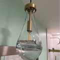 Much like the rhythm of a rainstorm itself. Suspended from slim black cords, drops of blown glass encase the bulbs creating the illusion of underwater illumination and cast luminous ripples that wash across ceilings and walls.