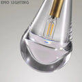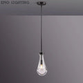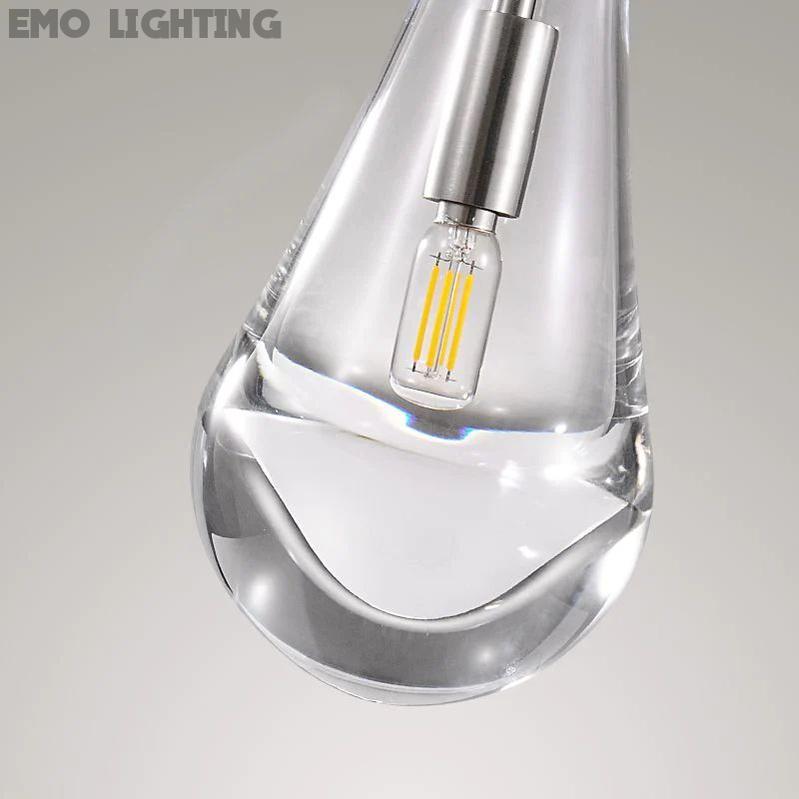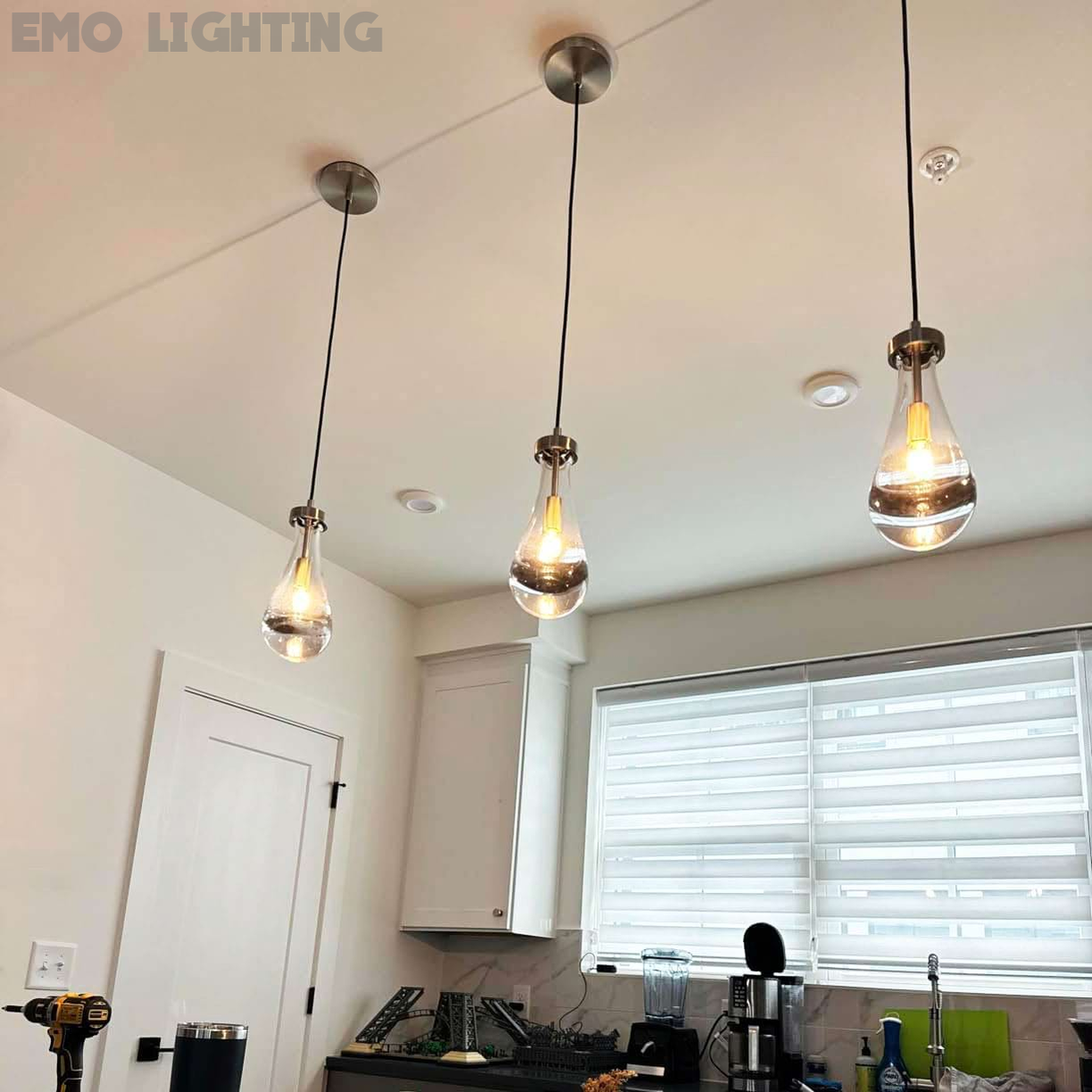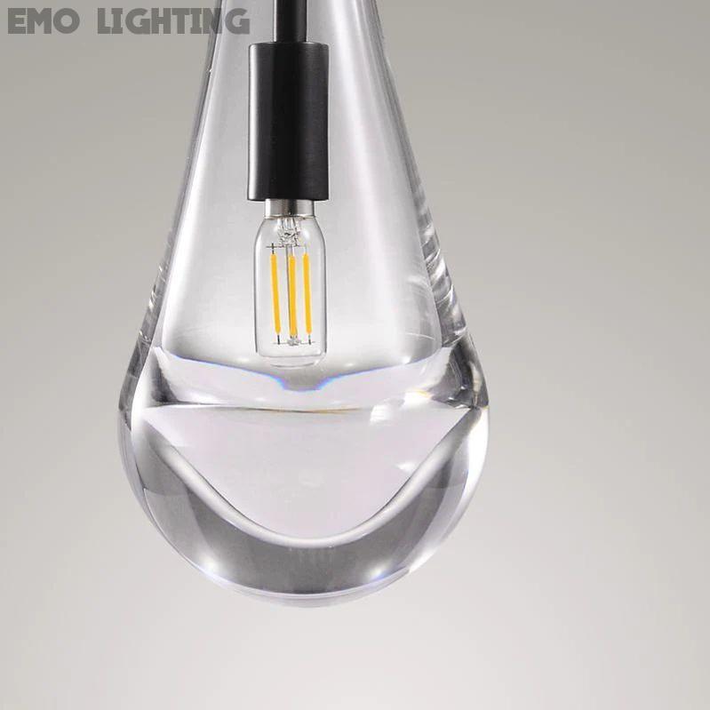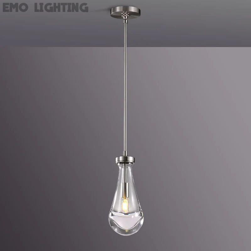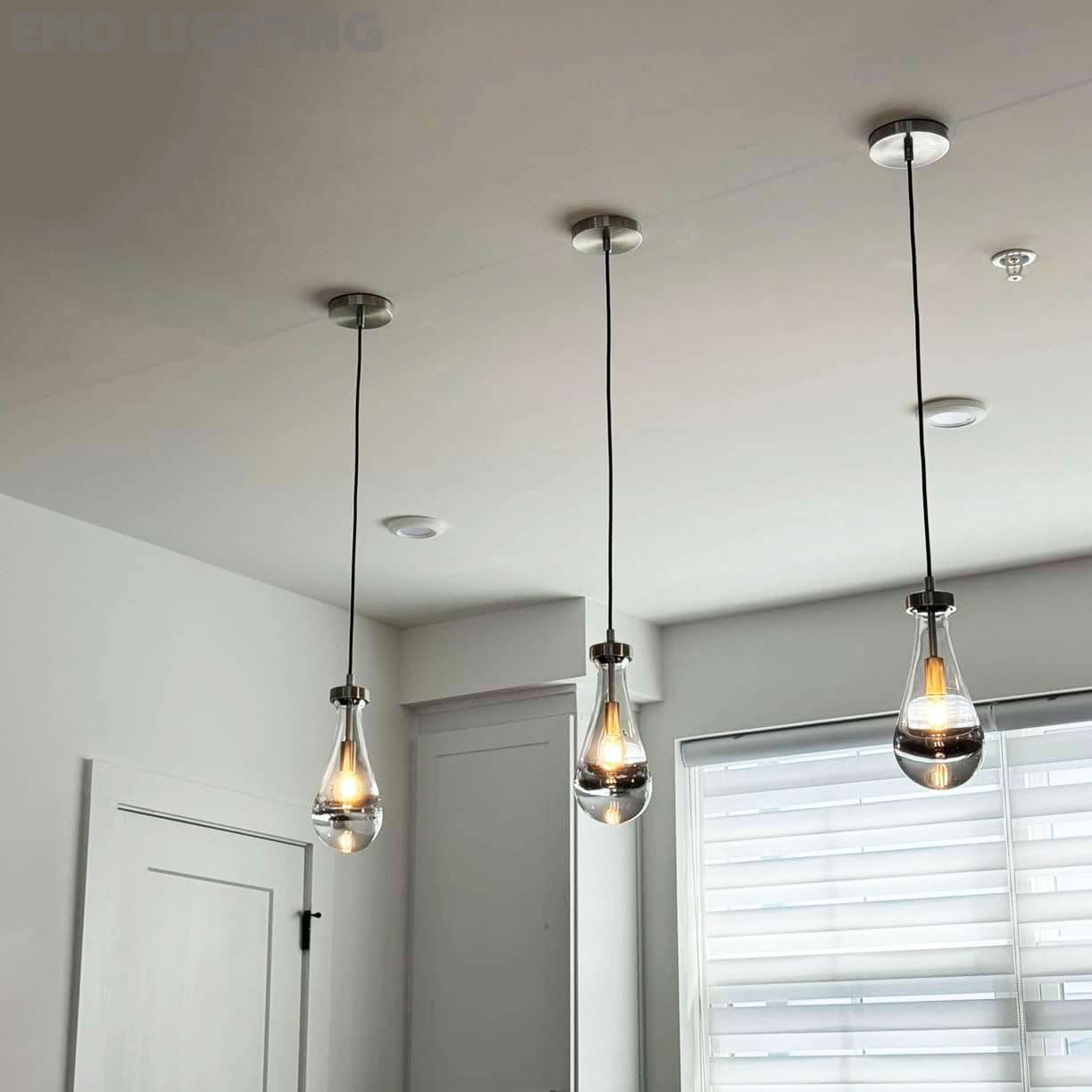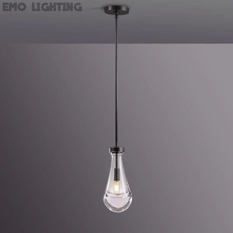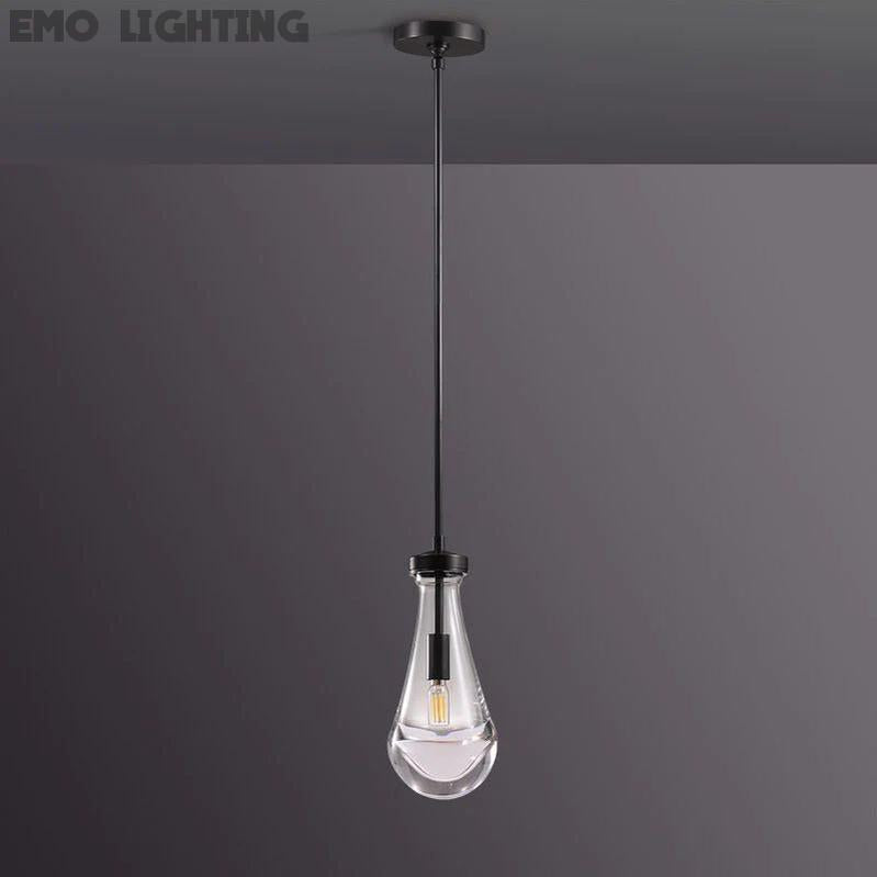 Much like the rhythm of a rainstorm itself. Suspended from slim black cords, drops of blown glass encase the bulbs creating the illusion of underwater illumination and cast luminous ripples that wash across ceilings and walls.