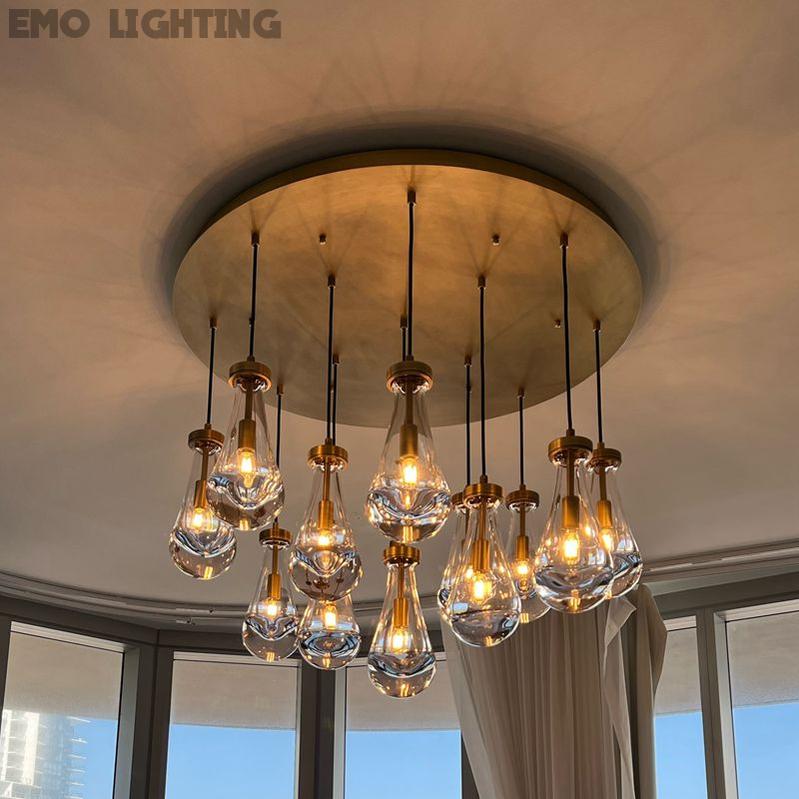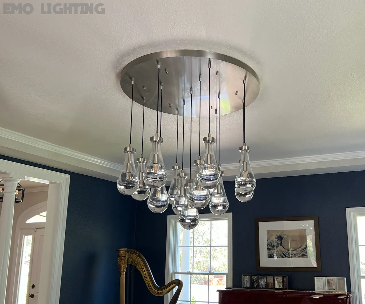 Much like the rhythm of a rainstorm itself. Suspended from slim black cords, drops of blown glass encase the bulbs creating the illusion of underwater illumination and cast luminous ripples that wash across ceilings and walls.