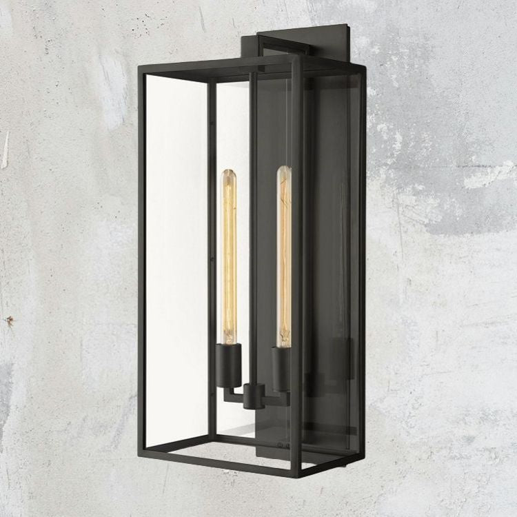 Modern interpretation of the classic lantern. Inspired by the glass-and-steel architecture of the International Style, the collection's strong linear forms transcend the utilitarian with elegant proportions and a sense of weightlessness.