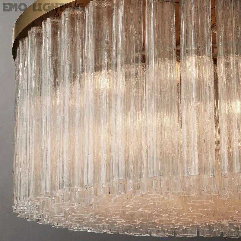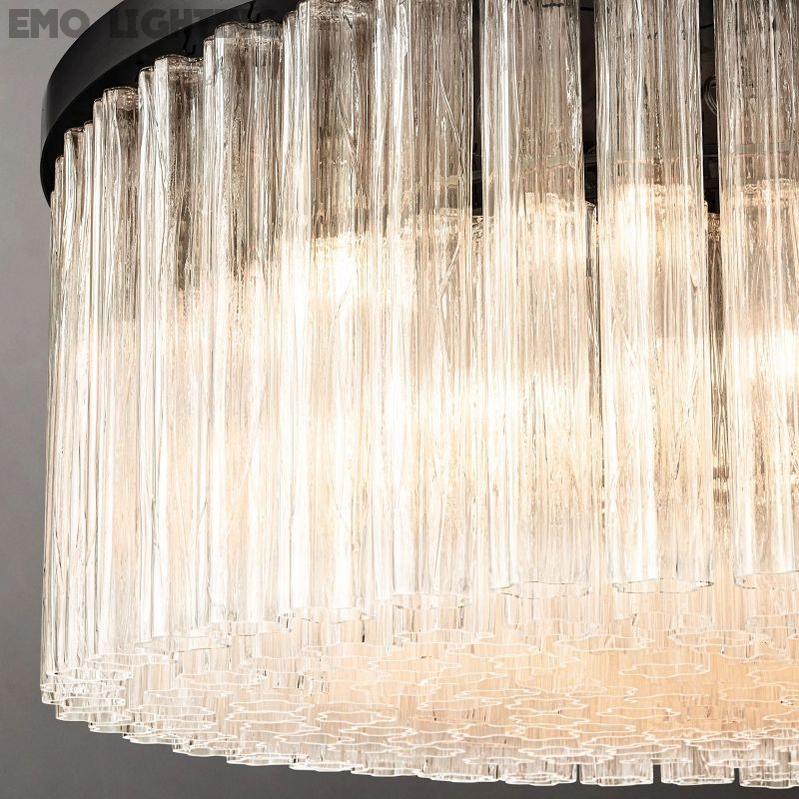 The collection creates a mesmerizing effect of liquid ice glistening in the light. The cascading glass layers feature fluted cylindrical pendants, each with fluid linear textures and loosely drawn flower shapes. When viewed from below, clusters of curvilinear forms create a shimmering pattern effect. Perfect for adding a touch of glamour and sophistication to any setting.