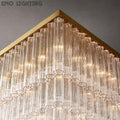 The collection creates a mesmerizing effect of liquid ice glistening in the light. The cascading glass layers feature fluted cylindrical pendants, each with fluid linear textures and loosely drawn flower shapes. When viewed from below, clusters of curvilinear forms create a shimmering pattern effect. Perfect for adding a touch of glamour and sophistication to any setting.
